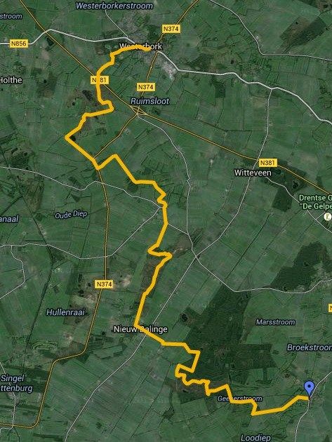 De start is op het parkeerterrein bij de hunebedden aan de weg (N353) van Wapserveen naar Havelte. De afstand is ruim 11 km.