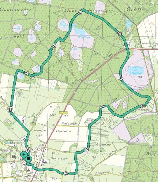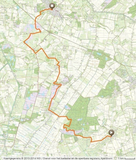 De start is op de brink in Gasteren. De route is 15,5 km lang.
